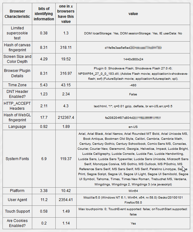 Running a test on Panopticlick reveals the extensive collection of information about the browser. Here’s a look: